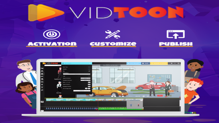 Vidtoonâ„¢ allows businesses to create and edit videos via a unified portal. It offers ready-to-go characters, royalty-free stock images, customizable backgrounds, and pre-built templates.